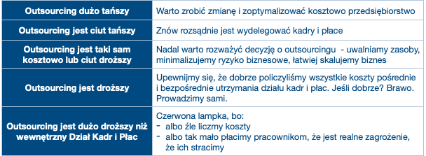 Jeśli z wyliczeń wychodzi, że przedsiębiorstwo taniej realizuje funkcje kadrowo-płacowe niż zrobiłaby to firma outsourcingowa to brawo! Jeśli jednak okazuje się, że koszty wewnętrznego działu kadr i płac/specjalisty są znacznie niższe od kosztów outsourcowania, to powinien być to sygnał ostrzegawczy.